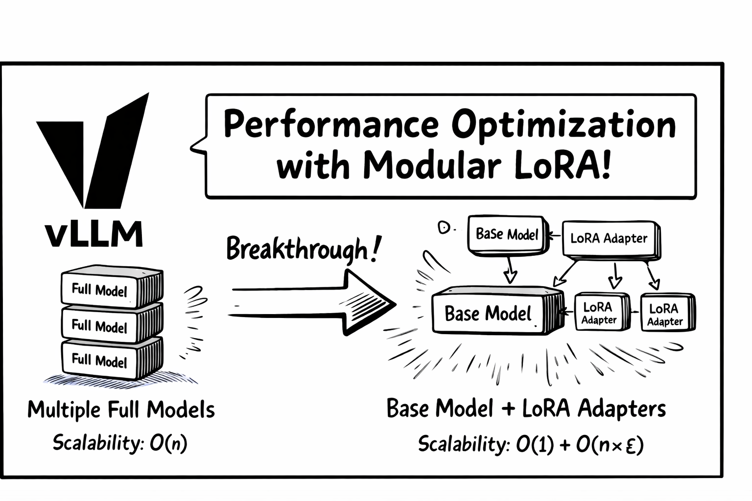 | After | 1 base model pass + N lightweight LoRA adapters | O(1) + O(n×ε) |